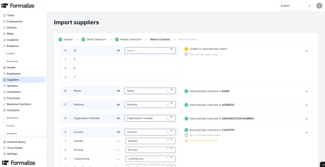 - Any Excel or CSV file can be uploaded — templates are optional. Because of this flexibility, a mapping step is always required. If you upload a file exported from the platform, or our provided template fields will be mapped automatically. The old supplier template is still fully compatible with the new import.