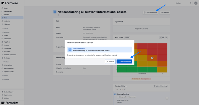After requesting an assessment, you can track the approval status inside the risk itself. Once approved, the risk version is finalized. If rejected, the risk can be revised and resubmitted.