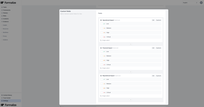 Custom fields allow you to add additional information fields to the Risk overview itself. Further, fields created here can be used to calculate consequence and probability inside Risk Types.