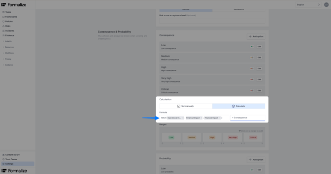 Selecting a risk type opens a configuration panel where you can configure consequence, probability and total risk score. The levels of consequence and probability create the overall risk matrix. The matrix can range from 3x3 to 7x7.