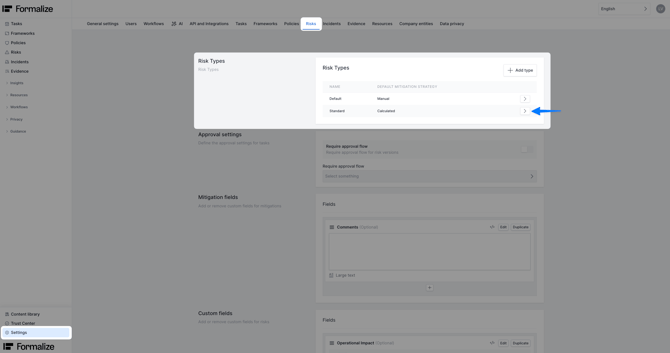 - Enter the name of the new risk type choose a mitigation type (learn more about calculated and manual mitigation in linked articles) and save.