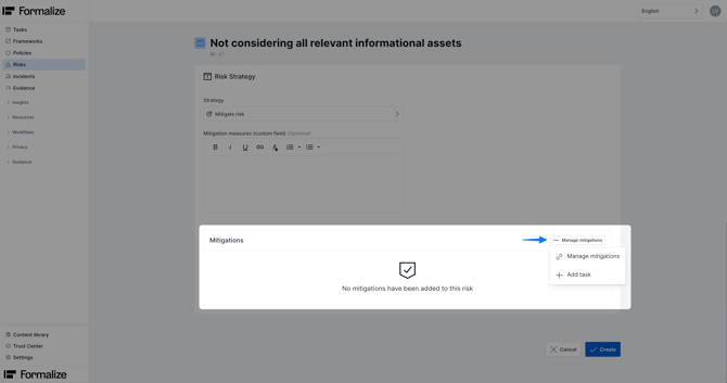 When updating a risk strategy, you can connect previously defined controls or tasks as mitigation connections. Alternatively, you can create a new task immediately.