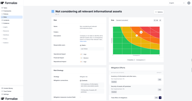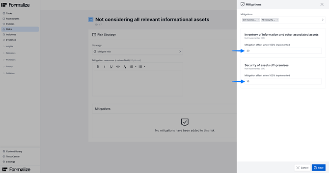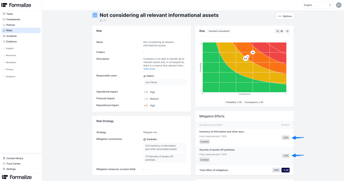 - Calculated mitigation: where risk reduction is modelled by Formalize when controls are implemented. In other words, once a control tied to a risk is implemented, Formalize automatically recalculates the residual risk by an overall set percentage, reflecting the lower probability or consequence.