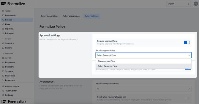 In Approval Settings, you can define a pre-set approval flow for your policy before publishing it.