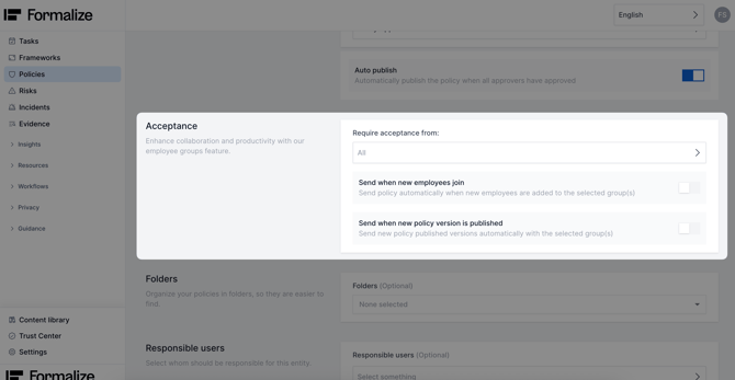 In the Acceptance area, you can select which pre-defined employee group(s) must accept the policy. You can also configure it so that the policy is automatically sent for acceptance whenever a new employee joins the group or a new policy version is published.