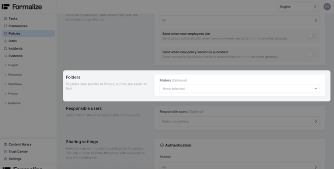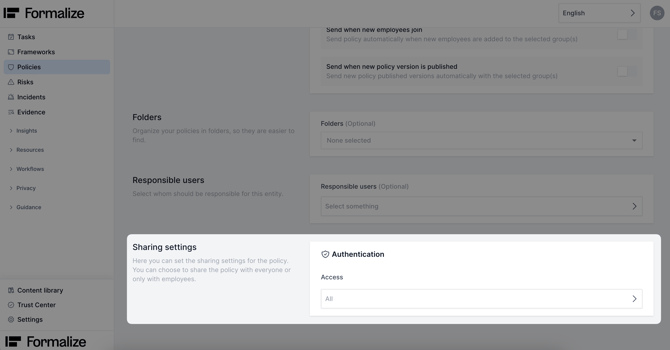 The Policy Settings section allows you to configure how your policies are managed and maintained. You can assign responsible users, set approval flows and control visibility and access for different employee groups. These settings ensure that every policy stays up to date, properly governed, and aligned with your organization’s compliance requirements.