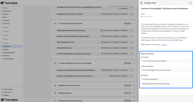 Click on View next to a theme. It will point to one or several Data connections. The text will provide context on the regulation, while the Data connections will provide a practical implementation step to be put in place. Click on any of the elements referenced to action them.
