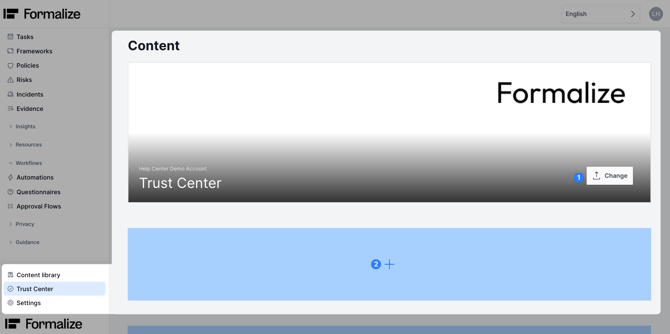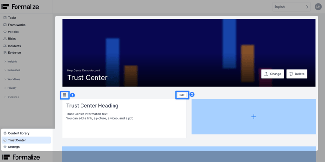 The content part will display the information that the viewers of the Trust Center can see. You can add pictures to the Trust Center, by clicking on Change.
