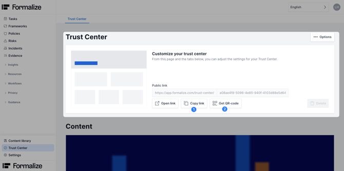 The Trust Center can be shared via a link or QR code. Copy and share the link, or download and share the QR code.