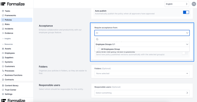 Learn how to manage policy acceptance in the Policy module, including selecting employee groups, tracking acknowledgments, and automating acceptance for new employees and policy versions to ensure clear, centralized, and audit-ready records.