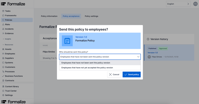 The next step is to click Send Policy. A pop-up will appear where you must choose who should receive the policy: employees who have not yet been sent the policy version, or employees who have not yet accepted the policy version.