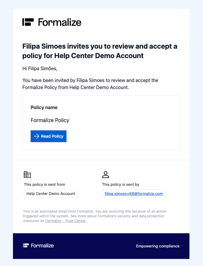 The employee gets an email notification with an invite to accept the policy.