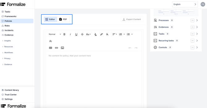 - Editor: Write and edit your policy directly in the platform.