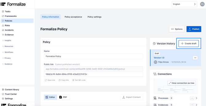 After creating your policy, it will open in Draft mode and start as Version 1.0.