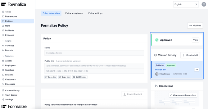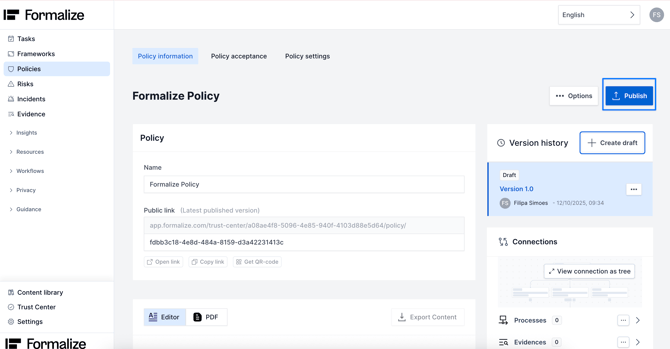 Once your policy is ready, you can publish it immediately by clicking Publish. This will lock the current version, preventing any further edits.