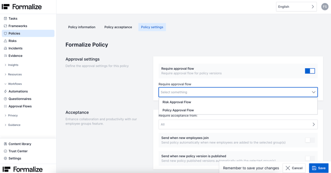 If you have a pre-defined approval flow that you want your Policy to go through before being published you need to: