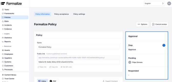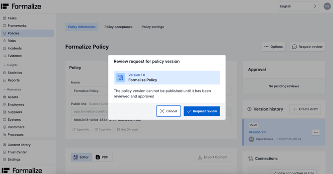 - Back in Policy information you need to Request review. This will trigger an email notification for the users associated with the chosen approval flow.