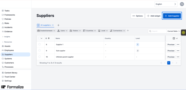 To add a new supplier in Formalize, navigate to the Resources section located in the right-side menu.