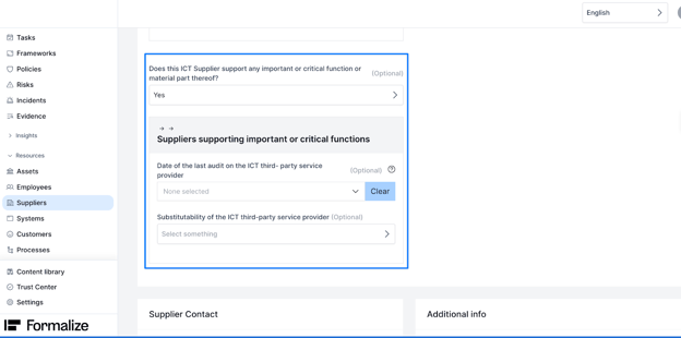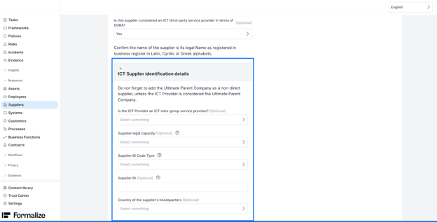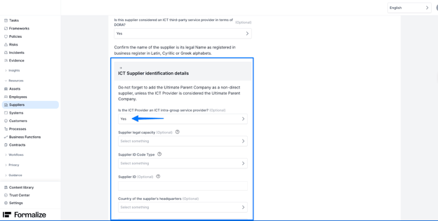 To trigger the form you will have to select “yes” on the question “Is this supplier considered an ICT third-party service provider in terms of DORA?”