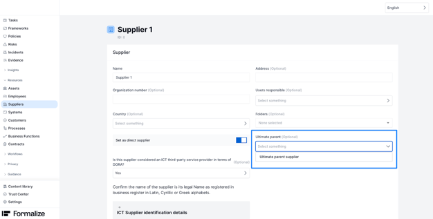 Intra-group suppliers should be created in the same manner as other direct suppliers. The only distinction is that you must indicate the supplier is an intra-group supplier within the "ICT Supplier identification details" section.