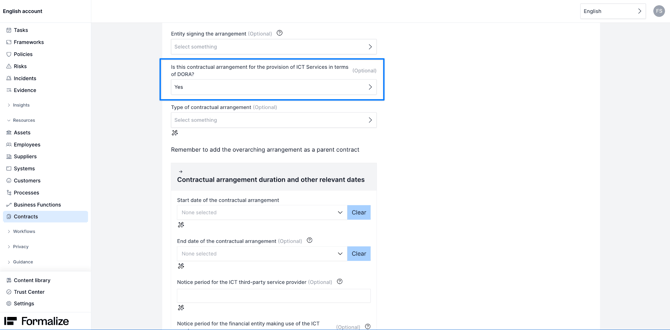To trigger the form you will have to select “yes” on the question “Is this contractual arrangement for the provision of ICT Services in terms of DORA?