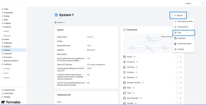 To connect a System with a Supplier, navigate to the Systems section. Choose the desired System, then click the "Options" button, followed by "Edit". In the "Suppliers" field, select the appropriate supplier chain for that System.