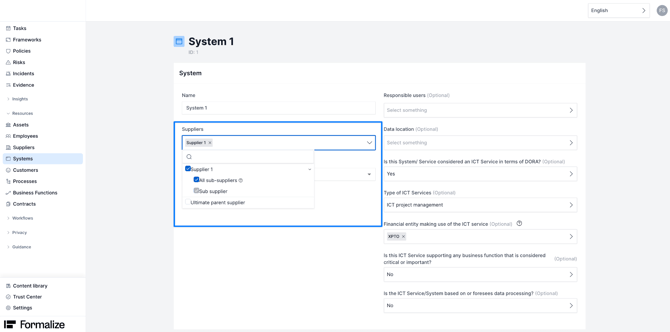 - Business Functions to the respective Contracts, Systems / ICT services and Suppliers