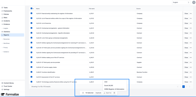 At the bottom, you will be able to see an option “Export as”, after clicking on it, format options come up: CSV, Excel (XLSX) and DORA Register of Information.