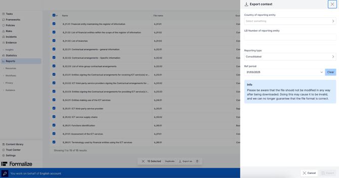 There you can find a folder called “DORA - Register of Information”, inside of that folder you are able to see the 15 reports that form the Register of Information. In order to export them, you need to click on the top box, which will select all the reports at once.