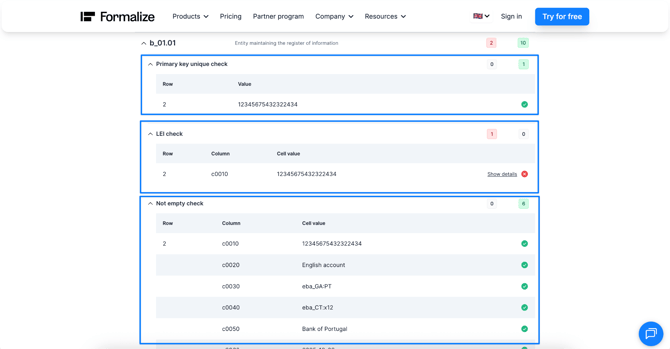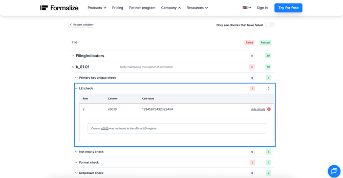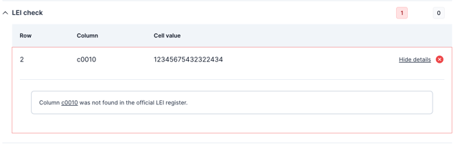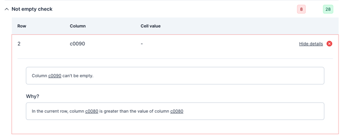 A more detailed inspection of the checks will identify the errors within the reports, pinpointing the exact row, column, and cell value. To see an even more comprehensive table of these errors, click on "Show details".
