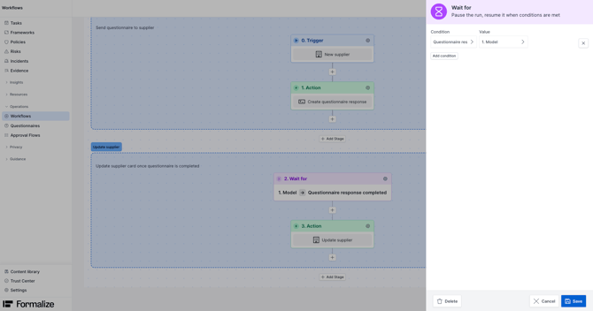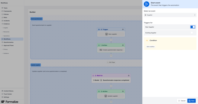 The Workflow Builder lets you create end-to-end workflows that map your real processes, assign tasks and responsibilities, and track progress across multiple stages. It builds on the capabilities of Automations while adding visual stages, conditional logic, and progress tracking, giving you greater control and flexibility. This feature can be used for incidents, contracts, suppliers, risks, and other workflows across your organization.