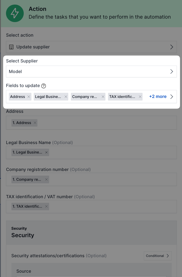 Fields to update: Choose which supplier fields you want the workflow to populate or overwrite.