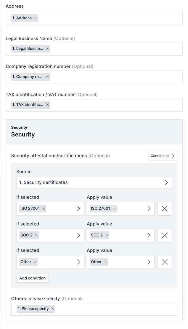 Make sure that each questionnaire field is correctly mapped to the corresponding field within the supplier profile, only mapped fields will be updated based on the questionnaire responses.